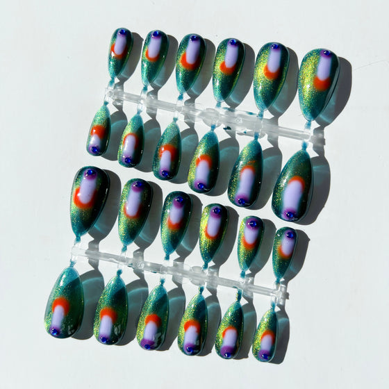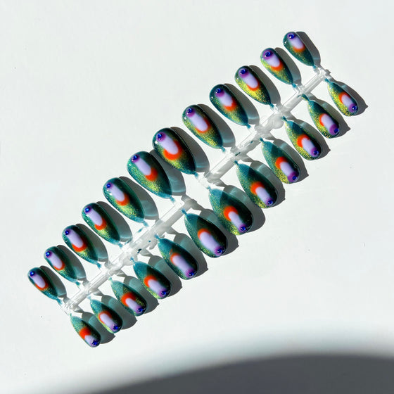 Each set of Pressies comes with 24 hand-painted nails, a file to shorten length/shape, a buffer to rough up your natural nail, a cuticle pusher, and glue!